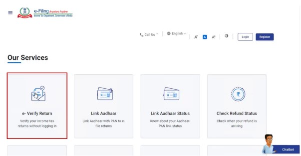Step 1: Go to the e-filing portal (www.incometax.gov.in) homepage and click e-Verify Return.