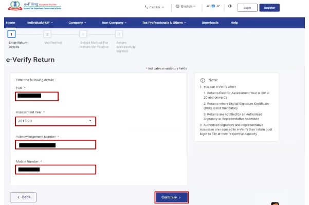 Step 2: On the e-Verify Return page, enter the Permanent Account Number (“PAN”) of the person filing the return of income, the relevant Assessment Year for which the ITR is being filed, the Acknowledgment Number of the ITR filed and Mobile Number available with you. Thereafter, click on Continue.