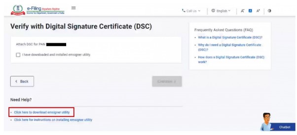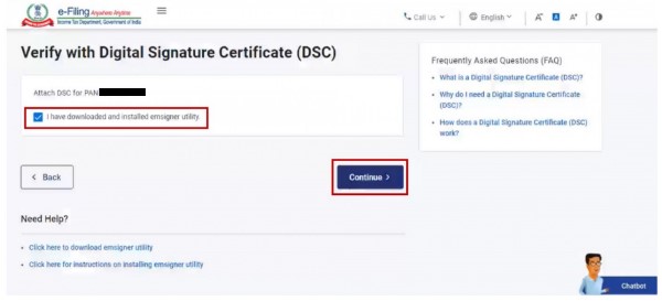 Step 3: After the download and installation of the emsigner utility, select I have downloaded and installed the emsigner utility on the Verify Your Identity page. Then click on Continue.