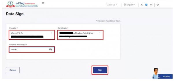 Step 4: On the Data Sign page, select the DSC details such as - Provider, Certificate and enter the Provider Password. Then click on Sign.