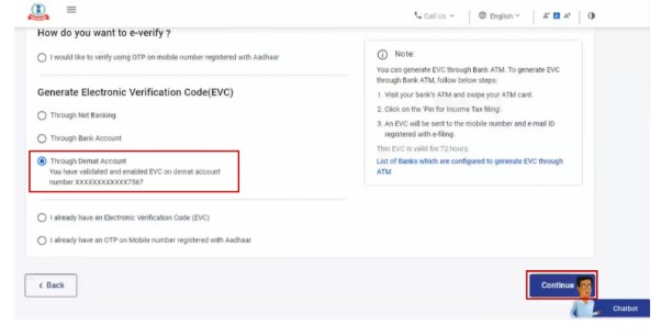 Step 1: On the e-Verify page, select “Through Demat Account” and click “Continue”.