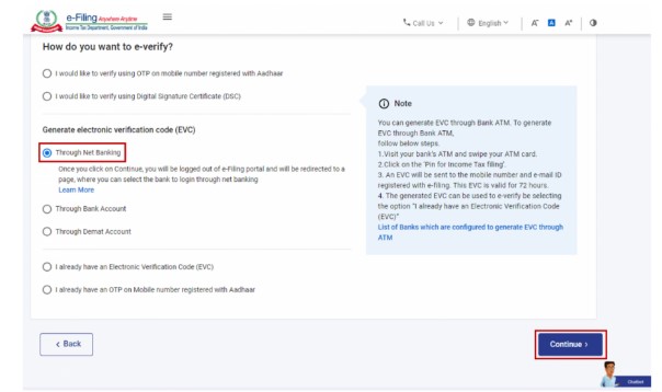 Step 1: On the e-Verify page, select Through Net Banking and click on Continue.