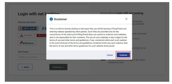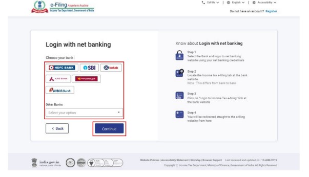 Step 5: Click on the link to log in to e-Filing from your bank's website.